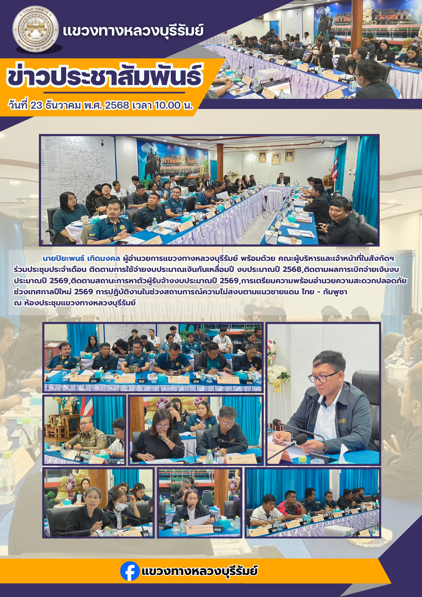 ประชุมประจำเดือน ติดตามการใช้จ่ายงบประมาณเงินกันเหลื่อมปี งบประมาณปี 2568,ติดตามผลการเบิกจ่ายเงินงบประมาณปี 2569,ติดตามสถานะการหาตัวผู้รับจ้างงบประมาณปี 2569,การเตรียมความพร้อมอำนวยความสะดวกปลอดภัยช่วงเทศกาลปีใหม่ 2569