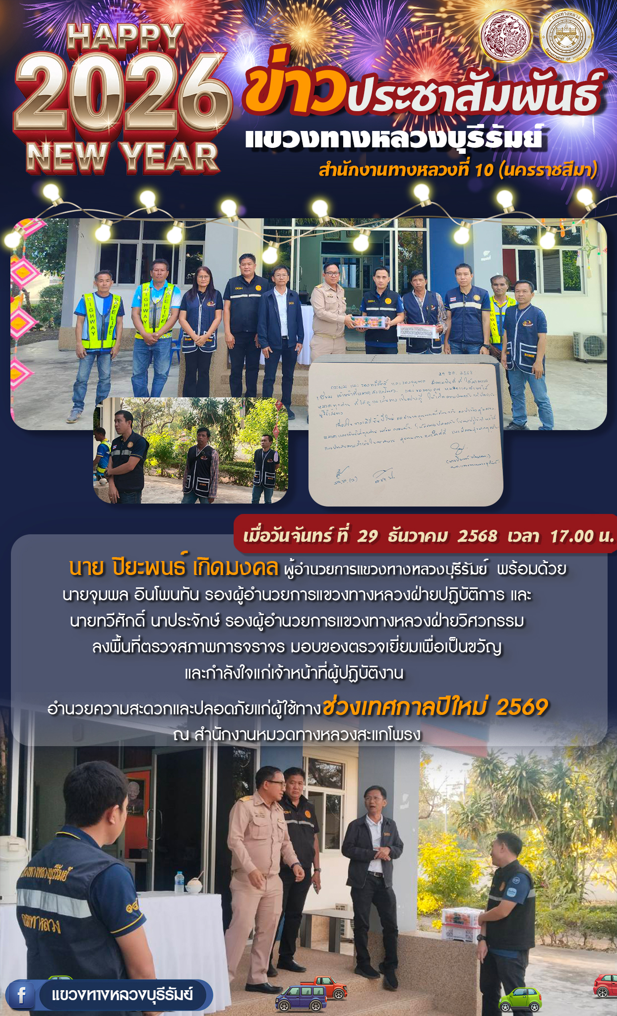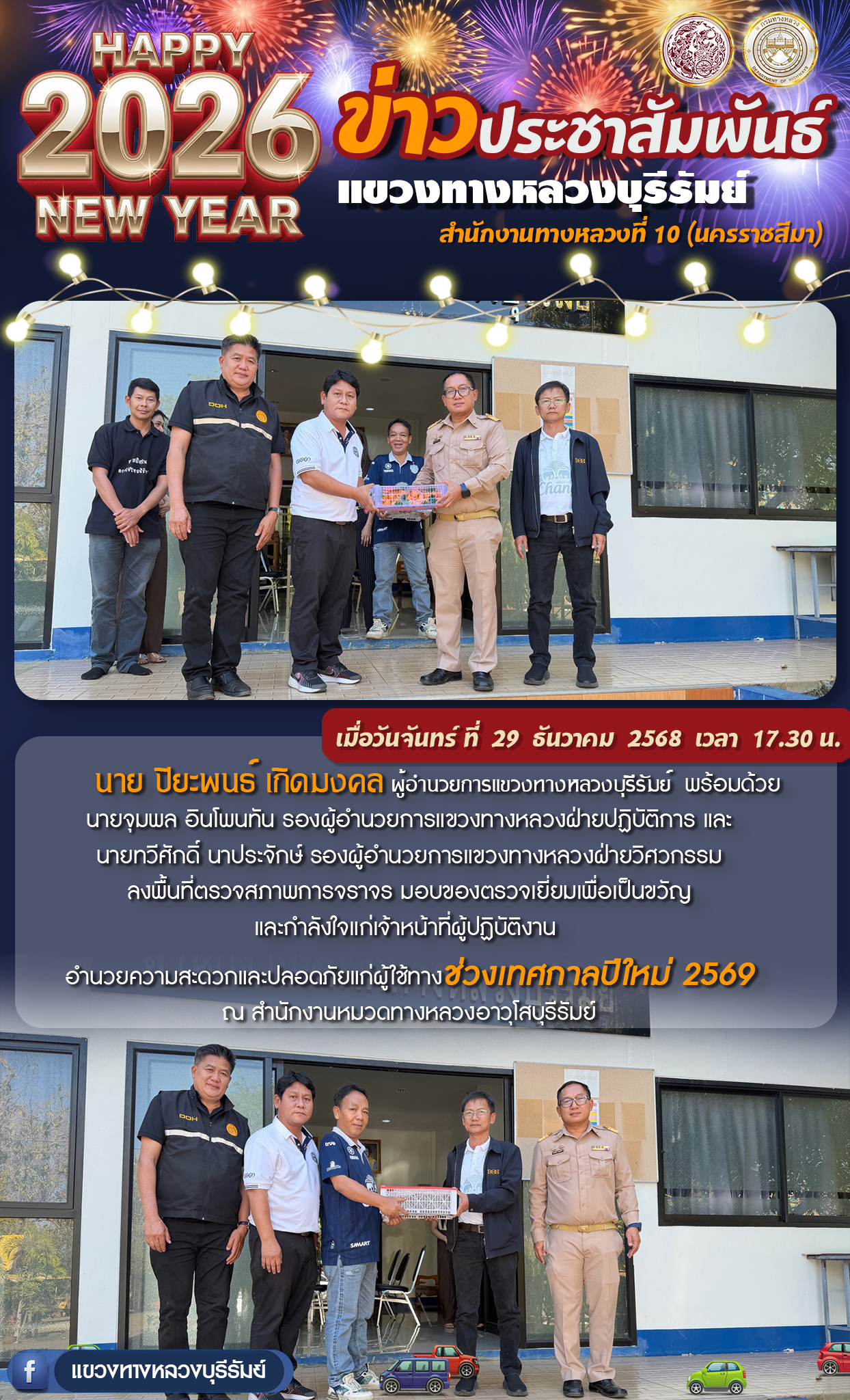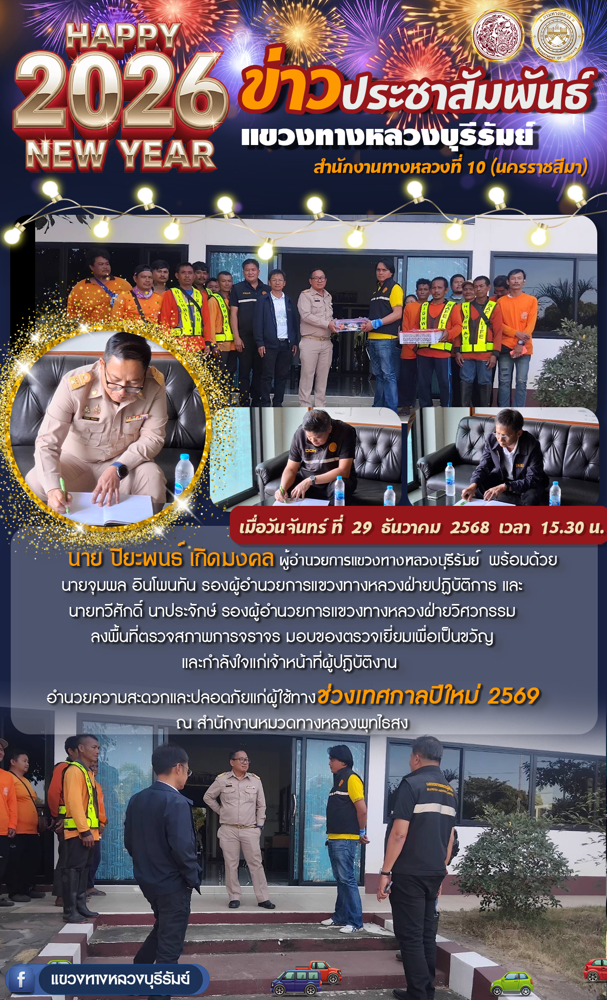 ลงพื้นที่ตรวจสภาพการจราจร มอบของตรวจเยี่ยมเพื่อเป็นขวัญ และกำลังใจแก่เจ้าหน้าที่ผู้ปฏิบัติงาน อำนวยความสะดวกและปลอดภัยแก่ผู้ใช้ทางช่วงเทศกาลปีใหม่ 2569