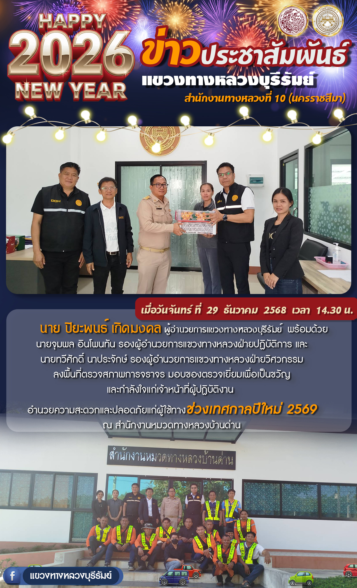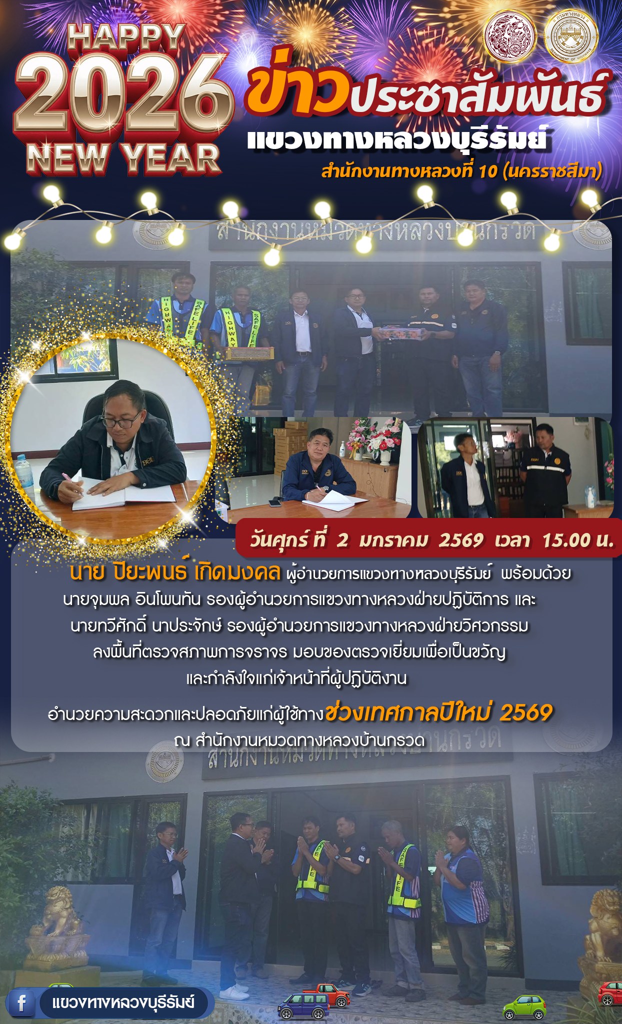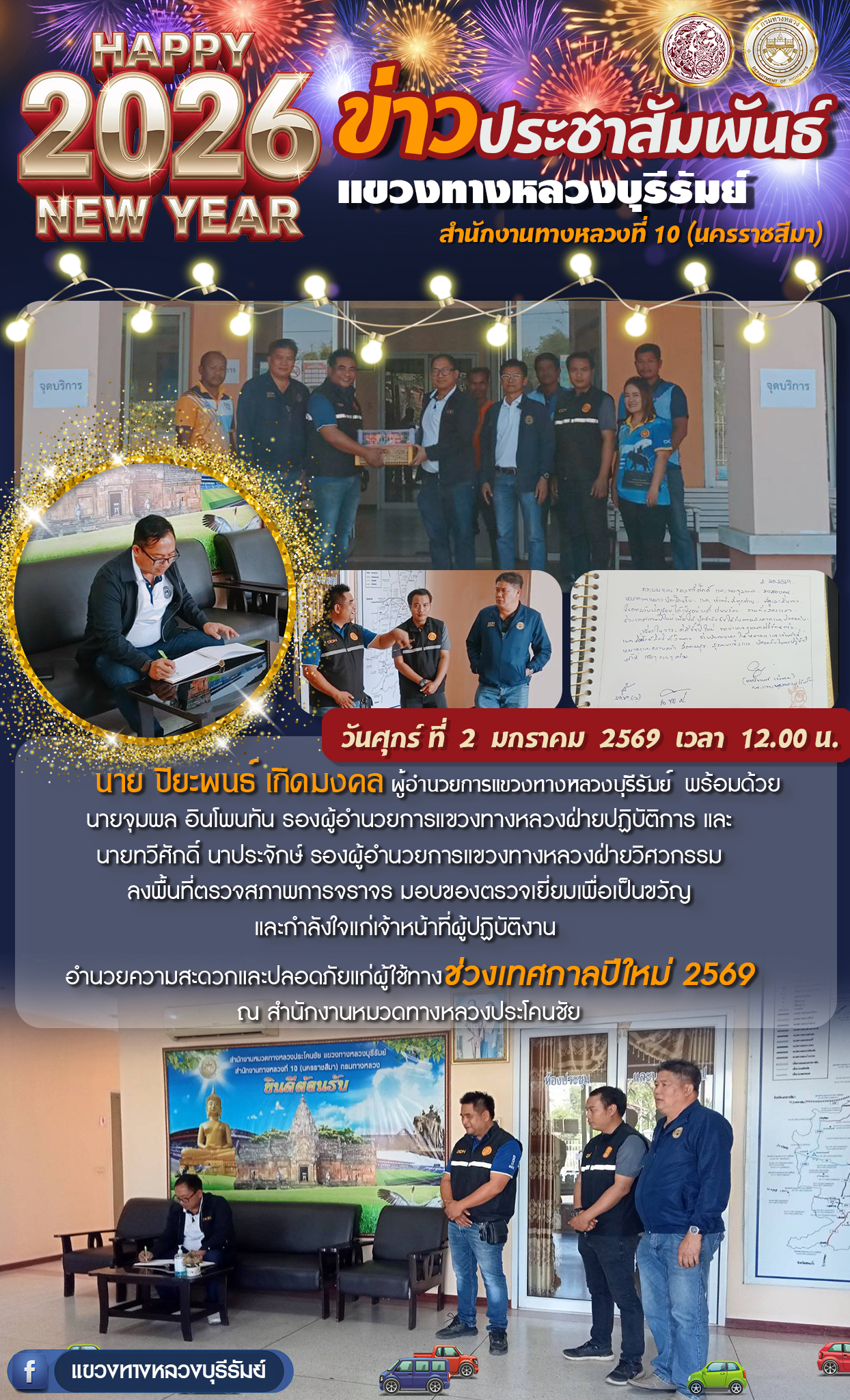 ลงพื้นที่ตรวจสภาพการจราจร มอบของตรวจเยี่ยมเพื่อเป็นขวัญ และกำลังใจแก่เจ้าหน้าที่ผู้ปฏิบัติงาน อำนวยความสะดวกและปลอดภัยแก่ผู้ใช้ทางช่วงเทศกาลปีใหม่ 2569