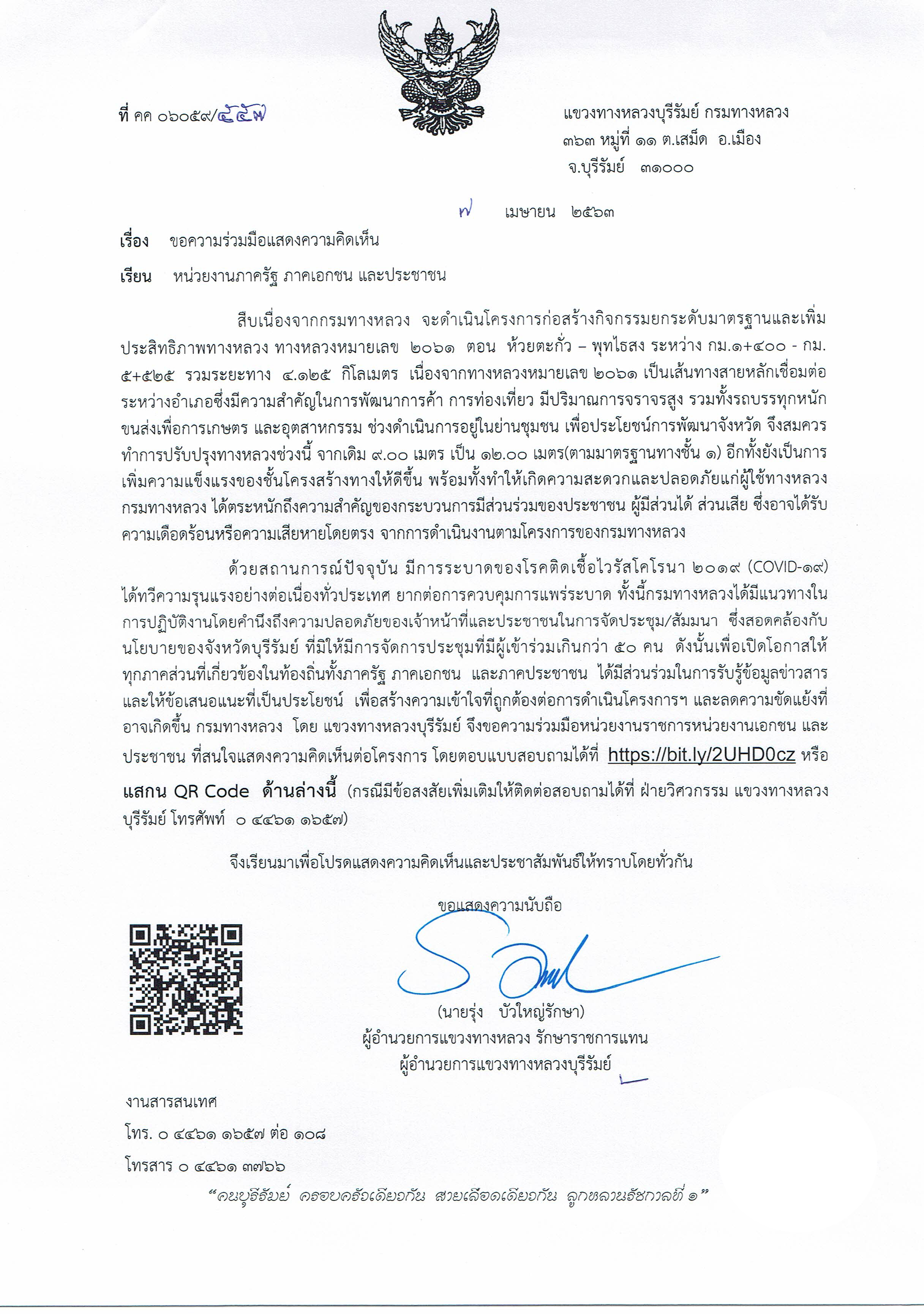 ขอเชิญชวนทุกท่านแสดงความคิดเห็นเกี่ยวกับโครงการก่อสร้างกิจกรรมยกระดับมาตรฐานและเพิ่มประสิทธิภาพทางหลวง ทางหลวงหมายเลข 2061 ตอน ห้วยตะกั่ว – พุทไธสง ระหว่าง กม.1+400 - กม.5+525 รวมระยะทาง 4.125 กิโลเมตร โดยตอบแบบสอบถามได้ที่ https://bit.ly/2UHD0cz หรือสแกนคิว QR Code