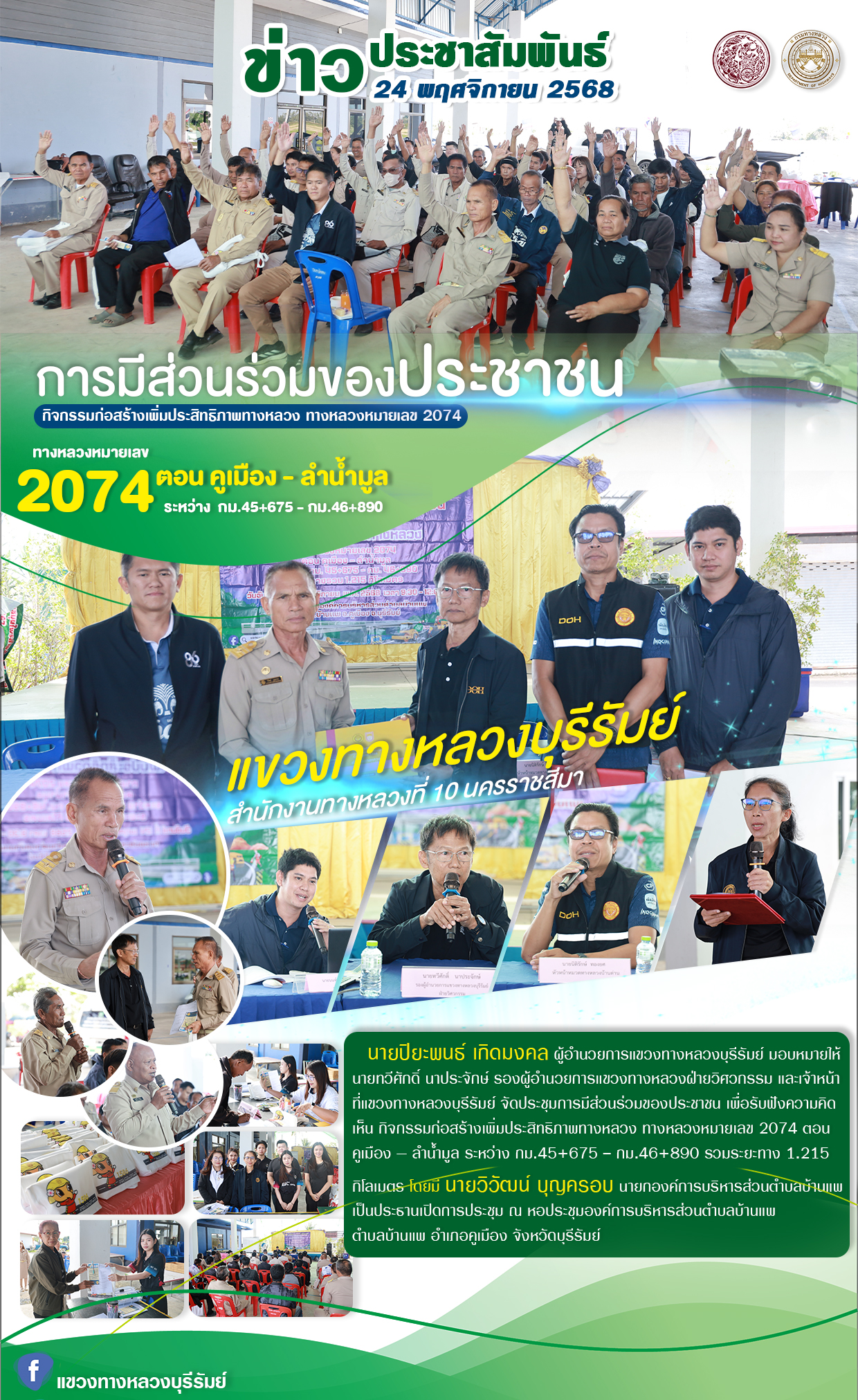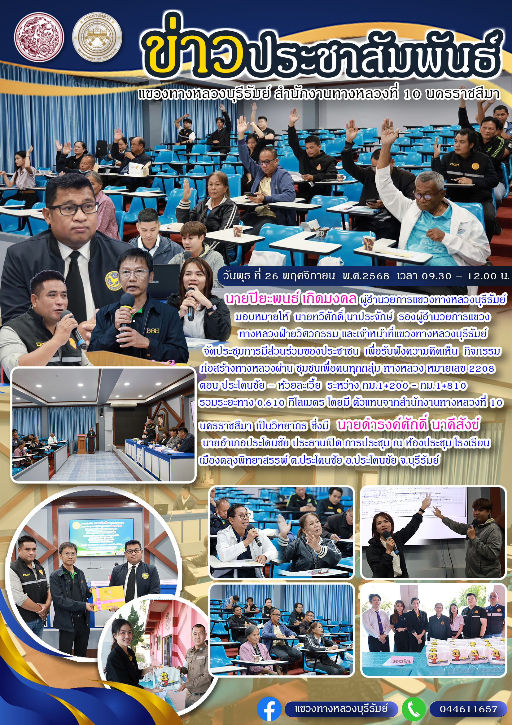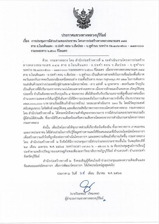 การประชุมการมีส่วนร่วมของประชาชน โครงการก่อสร้างโครงข่ายทางหลวงแผ่นดิน ทางหลวงหมายเลข 2445 สาย บุรีรัมย์ - นิคมบ้านกรวด ตอน บุรีรัมย์ - แสลงโทน ระหว่าง กม.10+750 - 17+400 และ ดม.19+385 - 24+000 รวมระยะทาง 11.268 กิโลเมตร