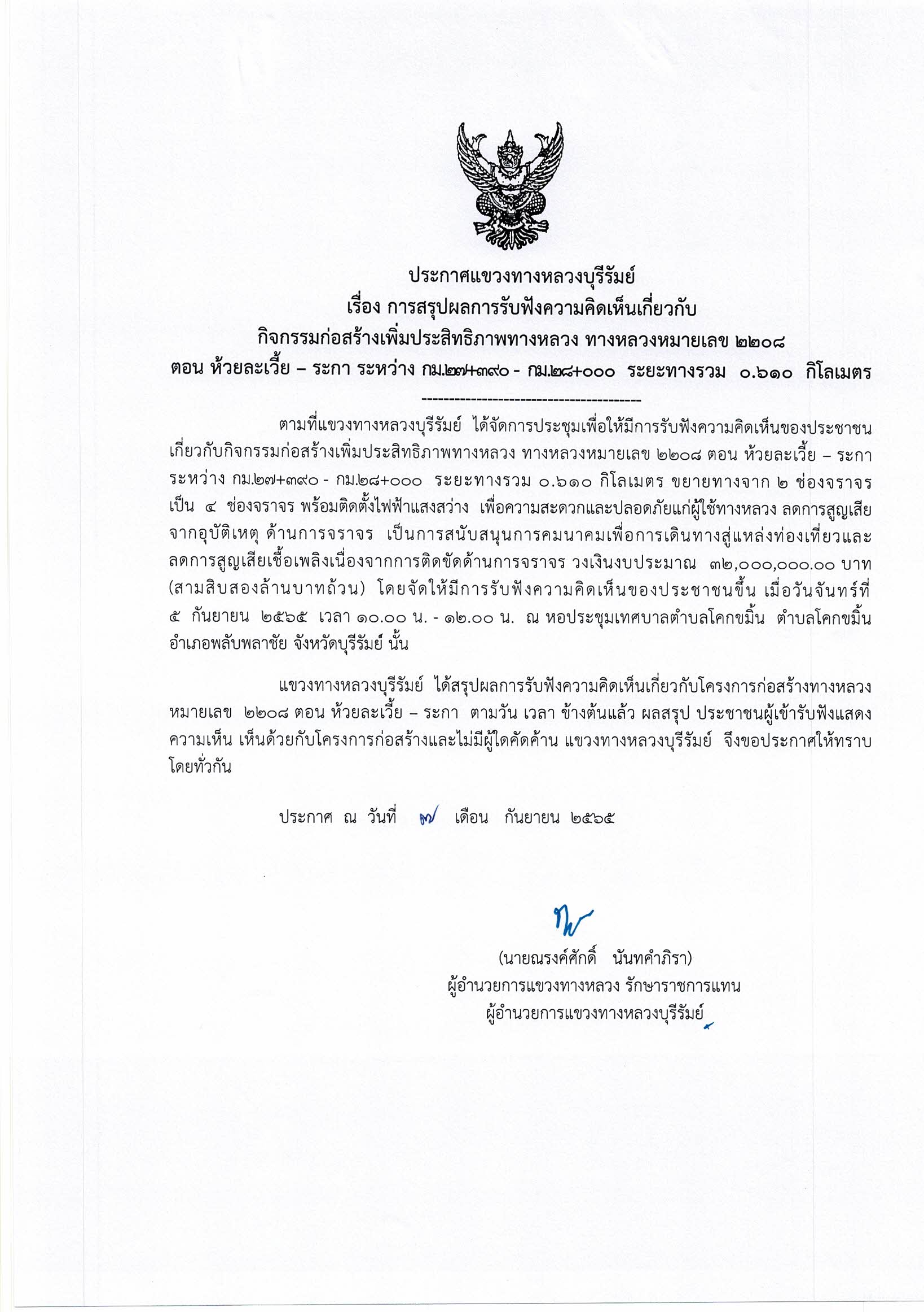 การสรุปผลการรับฟังความคิดเห็นเกี่ยวกับ กิจกรรมก่อสร้างเพิ่มประสิทธิภาพ ทางหลวง ทางหลวงหมายเลข 2208 ตอน ห้วยละเวี้ย - ระกา ระหว่าง กม.27+390 - กม.28+000 ระยะทาง 0.610 กิโลเมตร