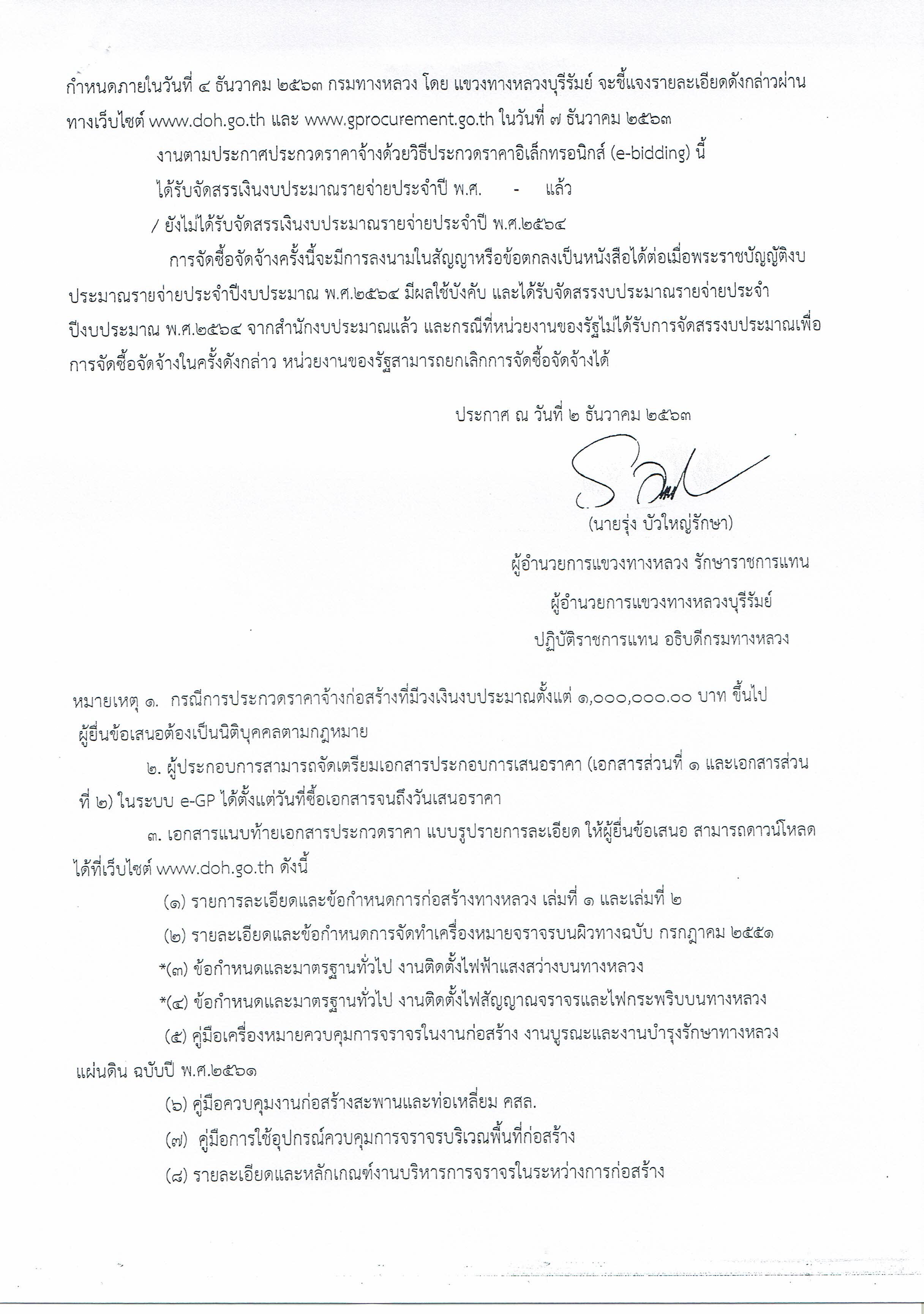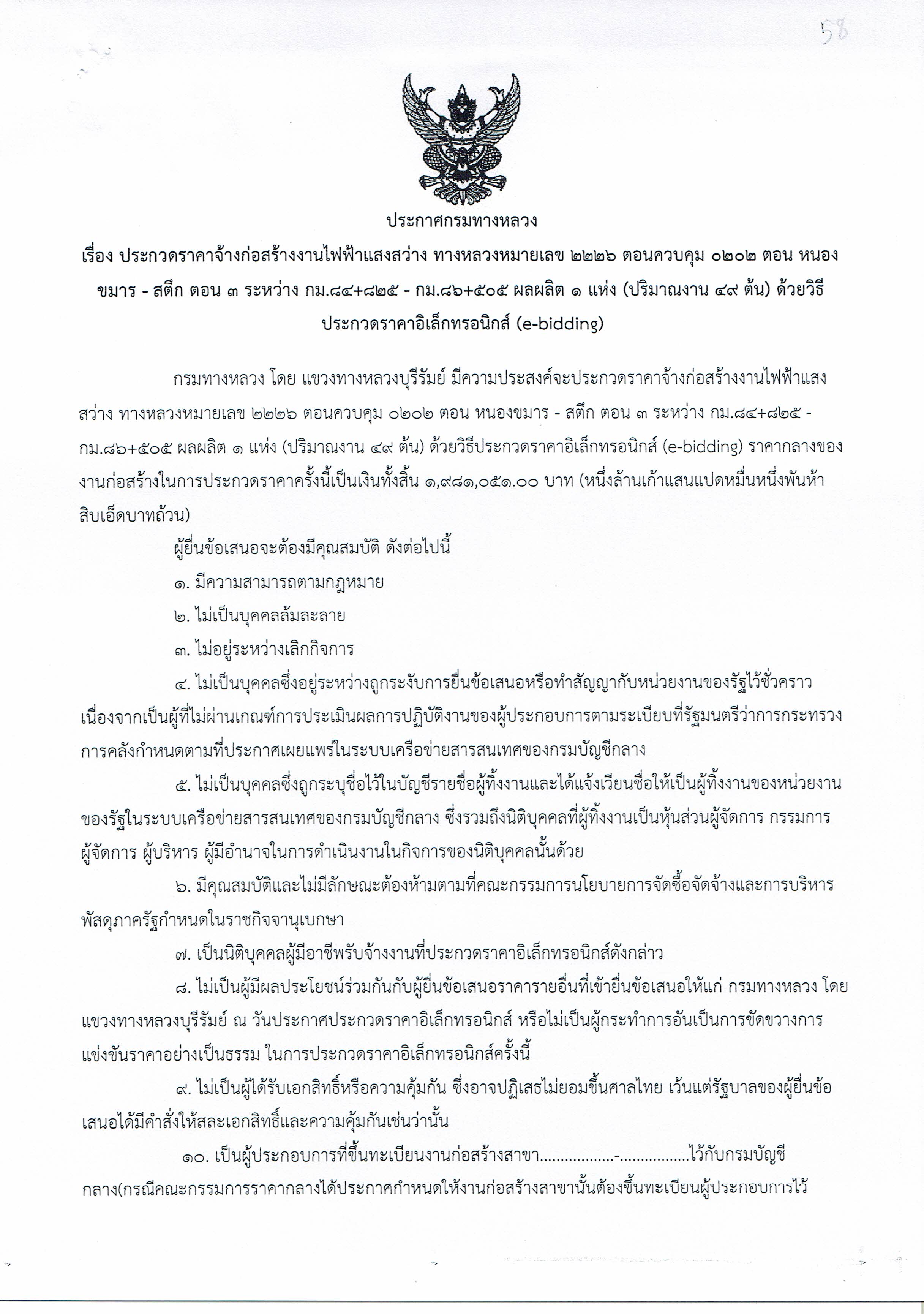 ประกวดราคาจ้างก่อสร้างงานไฟฟ้าแสงสว่าง ทางหลวงหมายเลข 2226 ตอนควบคุม 0202 ตอน หนองขมาร - สตึก ตอน 3 ระหว่าง กม.84+825 - กม.86+505 ผลผลิต 1 แห่ง (ปริมาณงาน 49 ต้น) ด้วยวิธีประกวดราคาอิเล็กทรอนิกส์ (e-bdidding)